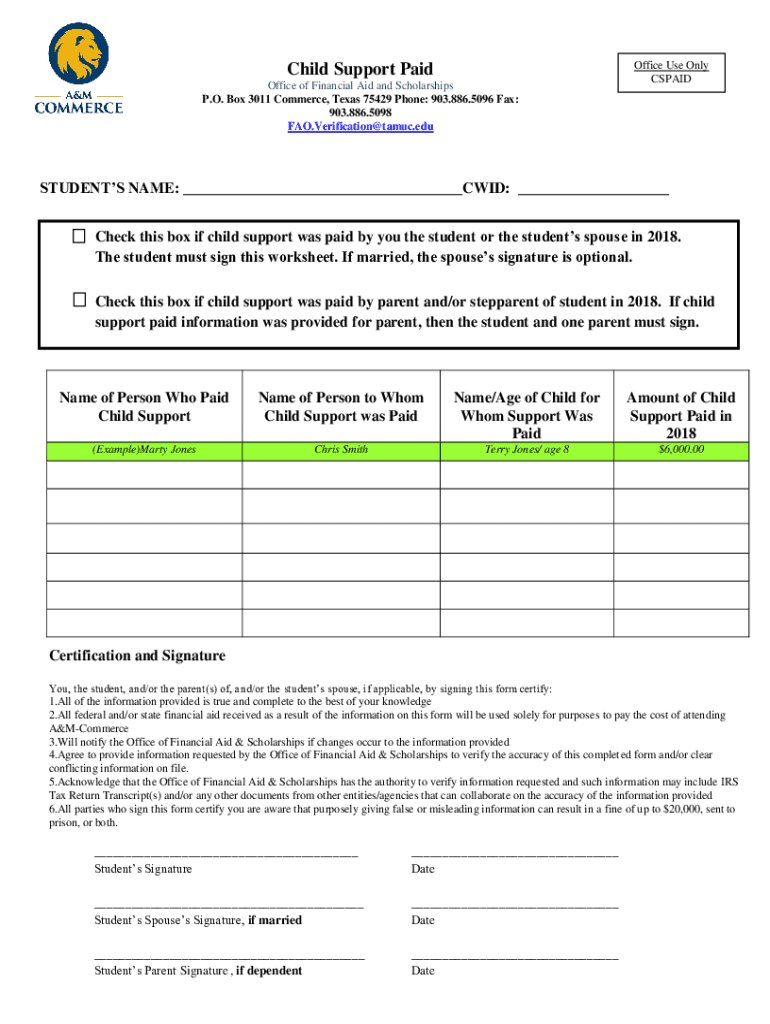 Child Support Paid Office of Financial Aid and Scholarships P.O. Box 3011 Commerce, Texas 75429 Phone: 903.886.5096 Fax: 903.886.5098 FAO. Verification Tamil. Office Use Only CSPAIDSTUDENTS NAME: