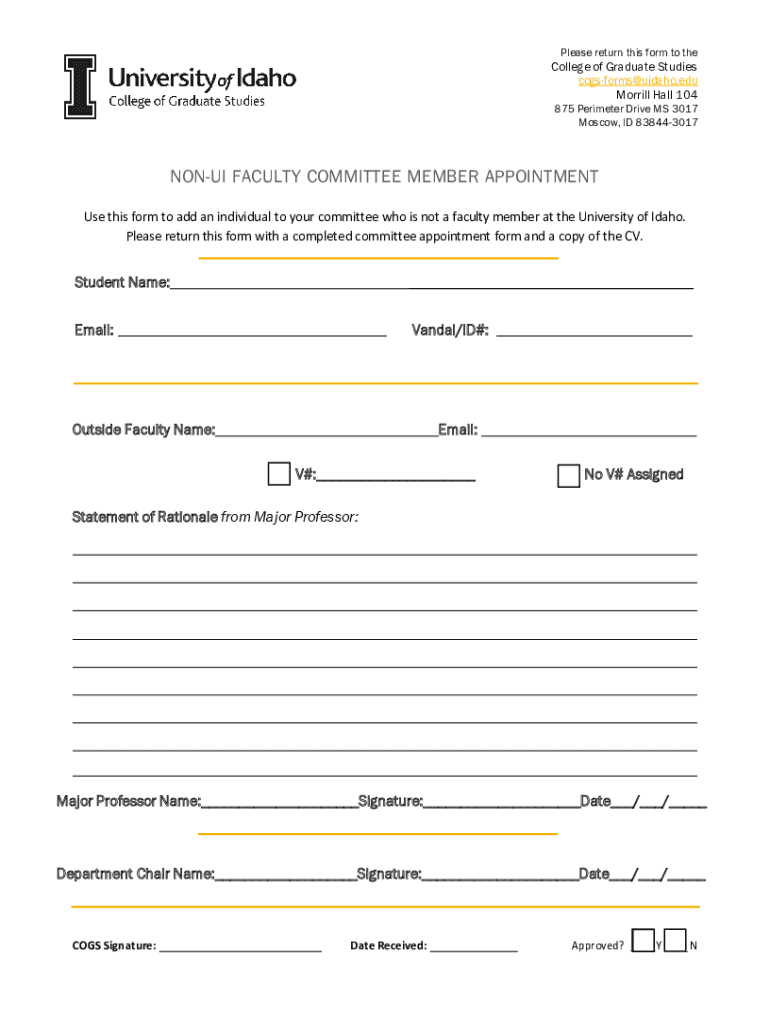 Please return this form to precollege of Graduate Studies cogs forms Idaho.edu Morrill Hall 104875 Perimeter Drive MS 3017 Moscow, ID 838443017NONUI FACULTY COMMITTEE MEMBER APPOINTMENT Use this form