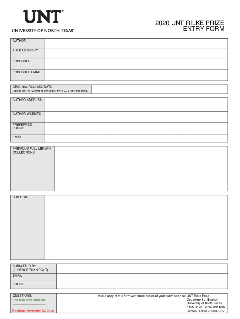 2020 UNT RILKE PRIZE ENTRY FORM AUTHOR TITLE OF ENTRY PUBLISHER EMAILORIGINAL RELEASE DATE (MUST BE BETWEEN NOVEMBER 2018 OCTOBER 2019)AUTHOR ADDRESSAUTHOR WEBSITE PREFERRED PHONE EMAILPREVIOUS FULL