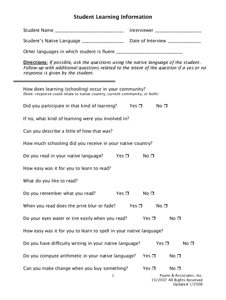 Student Learning Information Student Name Interviewer Students Native Language Date of Interview Other languages in which student is fluent Directions: If possible, ask the questions using the native