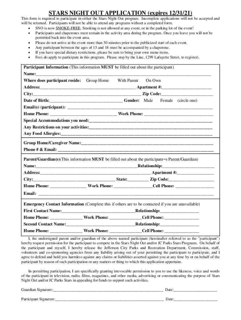 STARS NIGHT OUT APPLICATION (expires 12/31/21) This form is required to participate in either the Stars Night Out program. Incomplete applications will not be accepted and will be returned. Participants