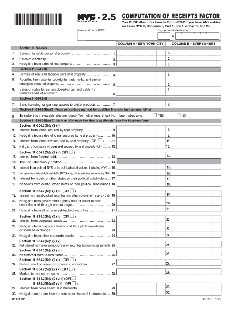 2.5×31411991×COMPUTATION OF RECEIPTS FACTOR You MUST attach this form to Form NYC2 if you have ANY entries on Form NYC2, Schedule F, Part 1, line 1, or Part 2, line 2a. Name as shown on NYC2Employer