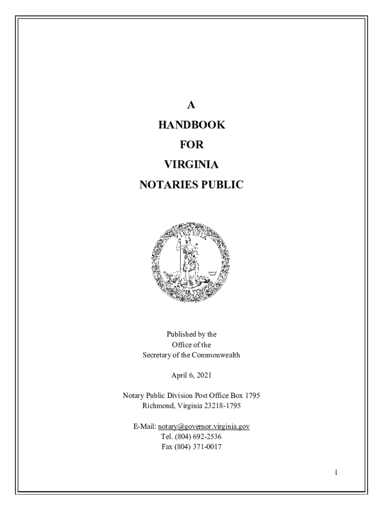 A HANDBOOK FOR VIRGINIA NOTARIES PUBLICPublished by the Office of the Secretary of the Commonwealth April 6, 2021, Notary Public Division Post Office Box 1795 Richmond, Virginia 232181795 Email: notary
