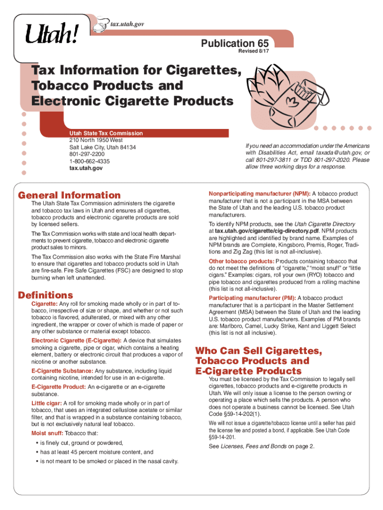 Get the free Pub 65, Utah Tax Information for Cigarettes, Tobacco Products & E-Cigarette ...