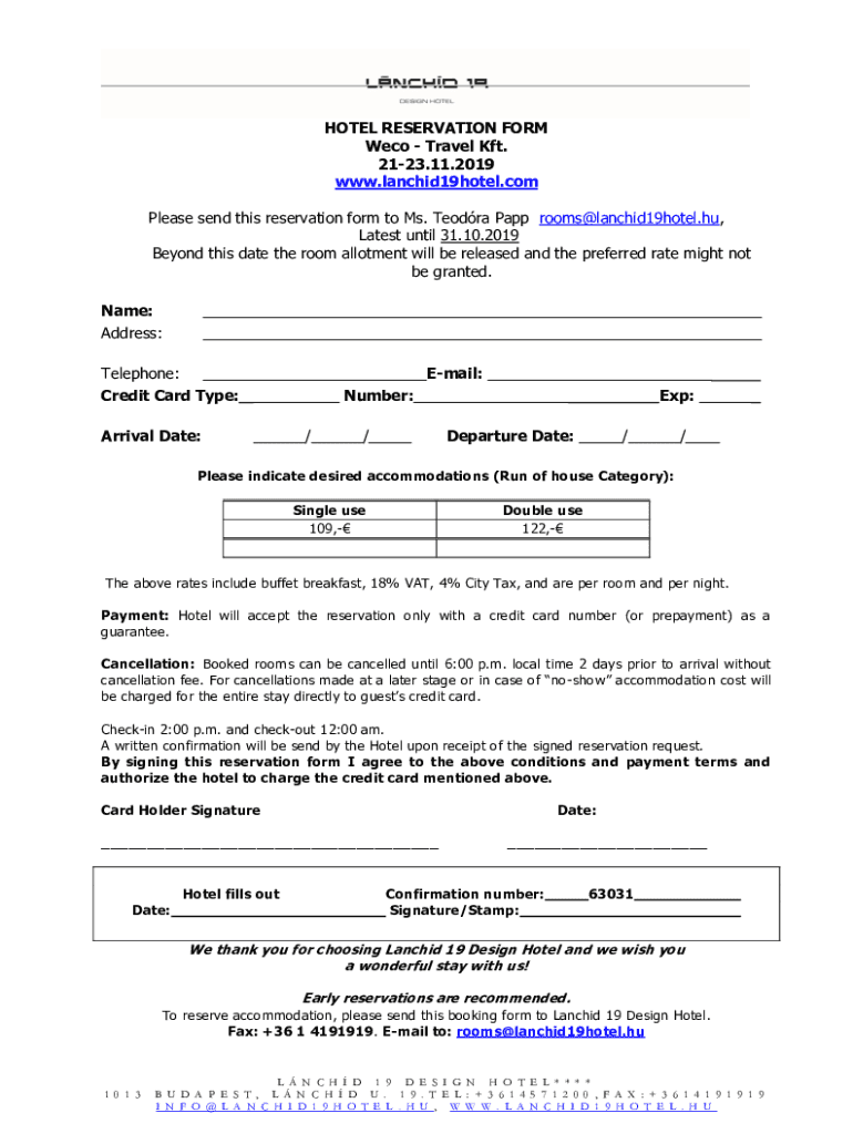 HOTEL RESERVATION FORM Eco Travel Ft. 2123.11.2019 www.lanchid19hotel.com Please send this reservation form to Ms. Terra PPP rooms lanchid19hotel. HU, Latest until 31.10.2019 Beyond this date the