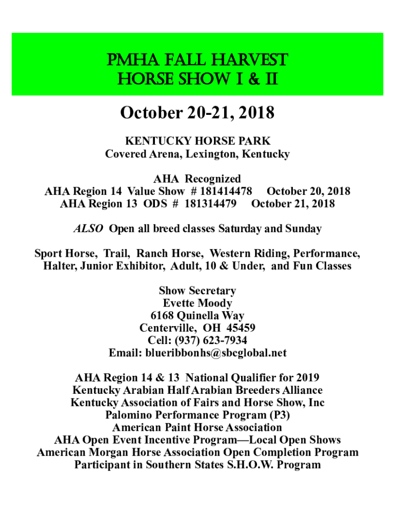 PMA Fall Harvest Horse Show I & II October 2021, 2018 KENTUCKY HORSE PARK Covered Arena, Lexington, Kentucky AHA Recognized AHA Region 14 Value Show # 181414478 October 20, 2018, AHA Region 13 ODS