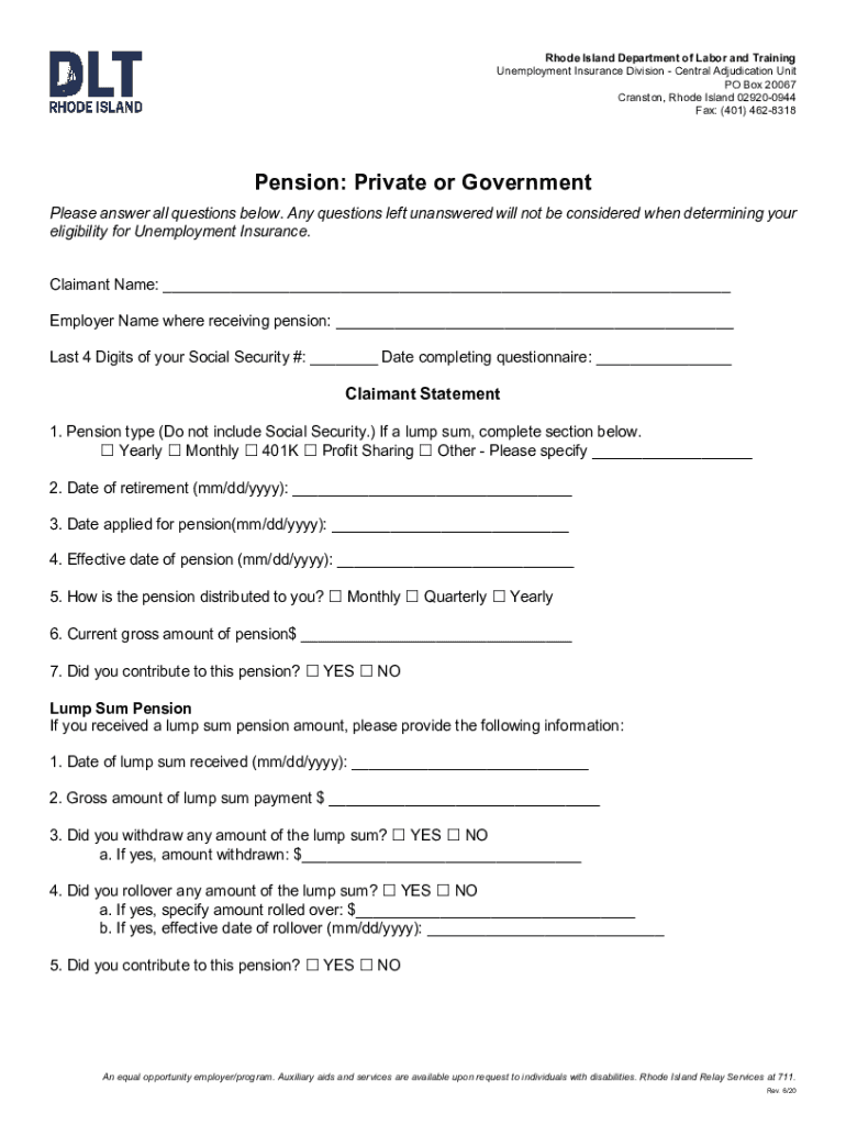 Rhode Island Department of Labor and Training Unemployment Insurance Division Central Adjudication Unit PO Box 20067 Cranston, Rhode Island 029200944 Fax: (401) 4628318Pension: Private or Government