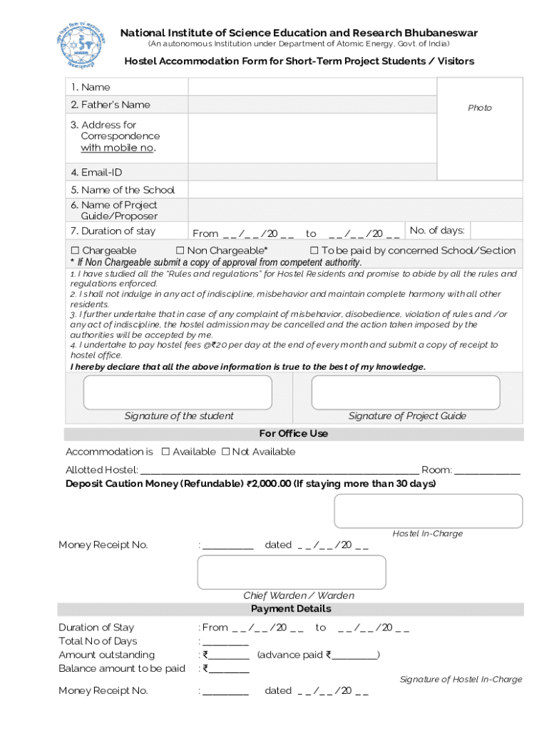 National Institute of Science Education and Research Bhubaneswar (An autonomous Institution under Department of Atomic Energy, Govt. of India)Hostel Accommodation Form for Shorter Project Students