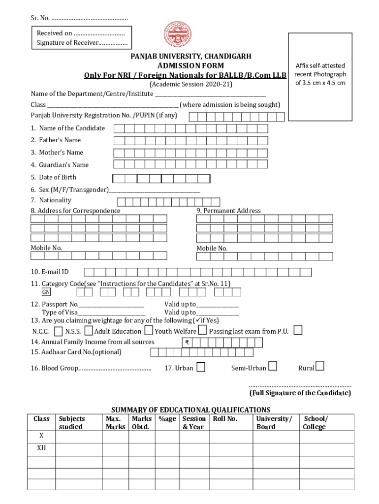 Sr. No. Received on Signature of Receiver. PUNJAB UNIVERSITY, CHANDIGARH Affix self attested ADMISSION FORM recent Photograph Only For NRI / Foreign Nationals for BALL/B.Com LLB(Academic Session 202021)