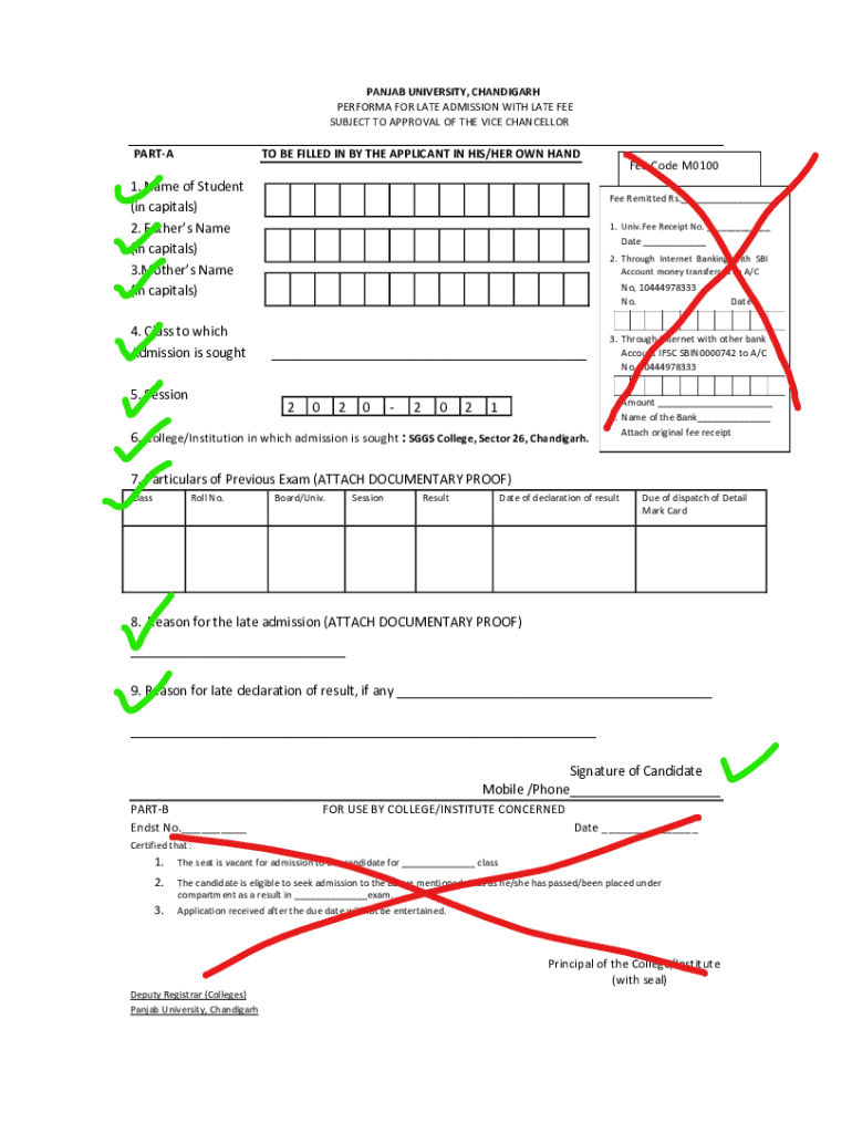 PUNJAB UNIVERSITY, CHANDIGARH Performs FOR LATE ADMISSION WITH LATE FEE SUBJECT TO APPROVAL OF THE VICE CHANCELLORPARTATO BE FILLED IN BY THE APPLICANT IN HIS/HER OWN HAND1. Name of Student (in capitals)