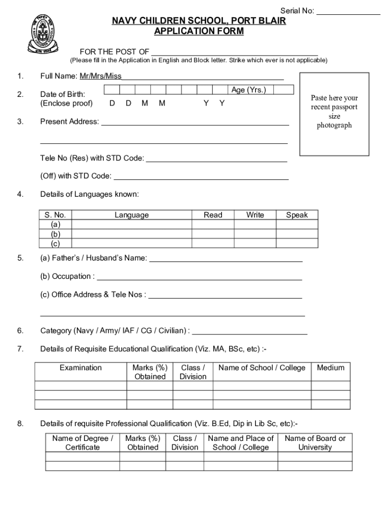 Serial No: NAVY CHILDREN SCHOOL, PORT BLAIR APPLICATION FORMER THE POST OF (Please fill in the Application in English and Block letter. Strike which ever is not applicable)1. Full Name: Mr/Mrs/Miss
