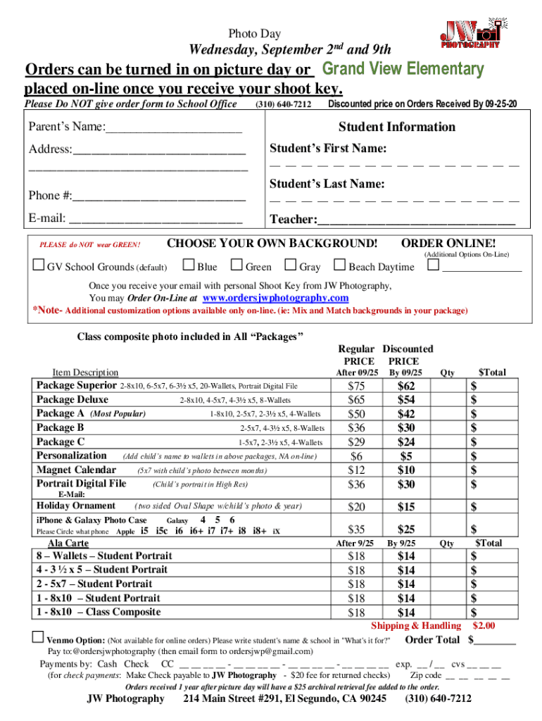 Photo Day Wednesday, September 2nd and 9thOrders can be turned in on picture day or Grand View Elementary placed online once you receive your shoot key. Please Do NOT give order form to School Office(310)