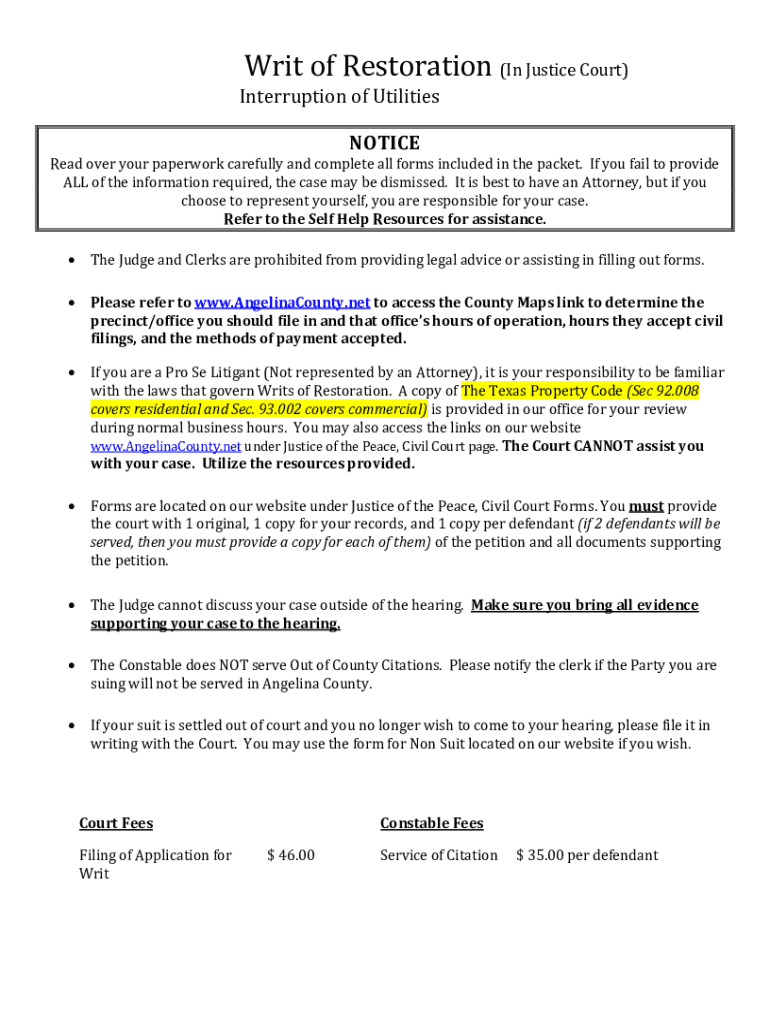 Writ of Restoration (In Justice Court)Interruption of Utilities Noticed over your paperwork carefully and complete all forms included in the packet. If you fail to provide All the information required,