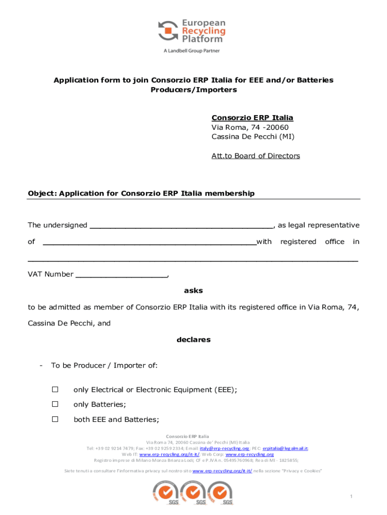 Application form to join Consortia ERP Italia for EEE and/or Batteries Producers/ImportersConsorzio ERP Italia Via Roma, 74 20060 Cassia De Pecchi (MI) ATT.to Board of DirectorsObject: Application
