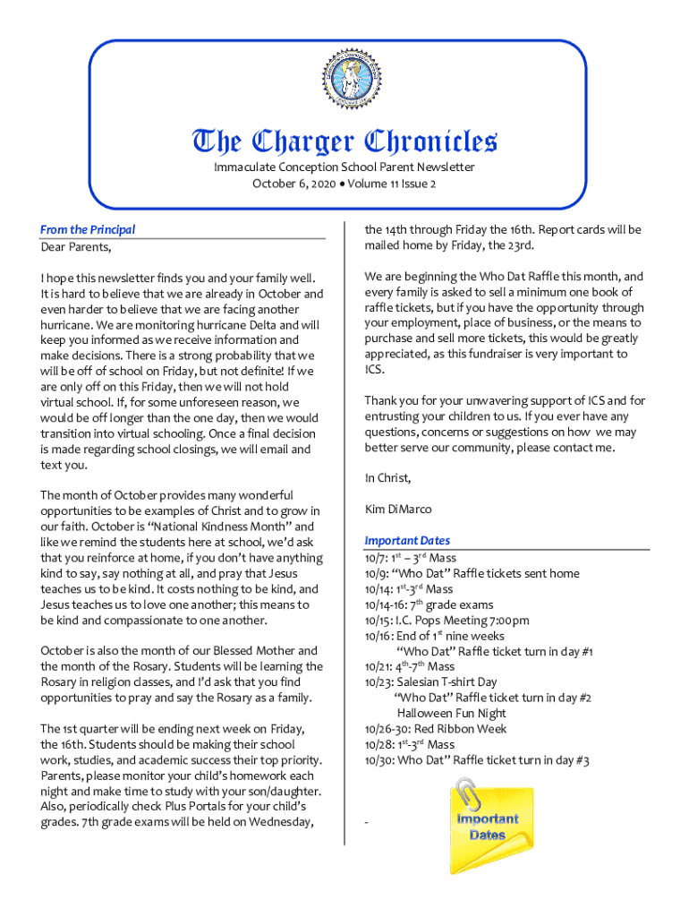 The Charger Chronicles Immaculate Conception School Parent Newsletter October 6, 2020, Volume 11 Issue 2From the Principal Dear Parents, the 14th through Friday the 16th. Report cards will be mailed