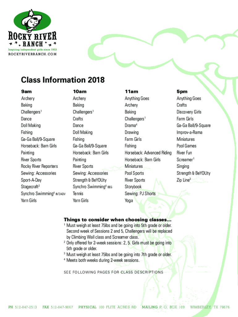 RO CK Y R I V E R R A NC H. C OM Class Information 2018 9am Archery Baking Challengers1 Dance Doll Making Fishing Gaga Ball/9Square Horseback: Barn Girls Painting River Sports Rocky River Reporters