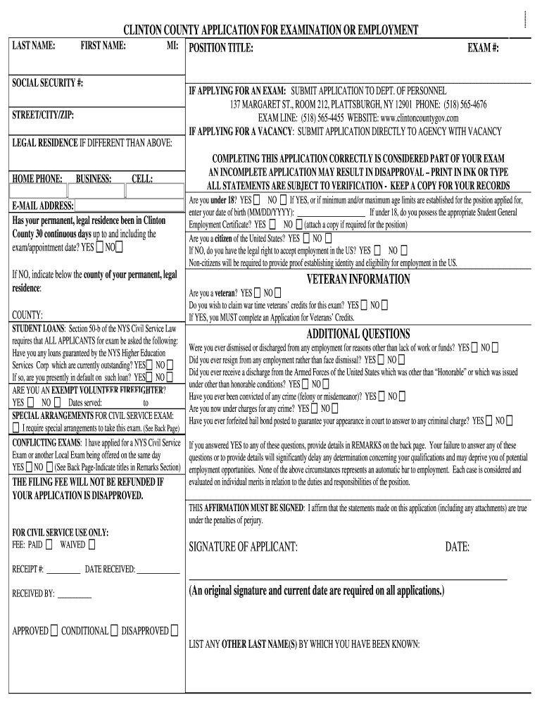 ''''''''''' CLINTON COUNTY APPLICATION FOR EXAMINATION OR EMPLOYMENT LAST NAME: FIRST NAME: MI: EXAM #: IF APPLYING FOR AN EXAM: SUBMIT APPLICATION TO DEPT. OF PERSONNEL 137 MARGARET ST., ROOM 212,