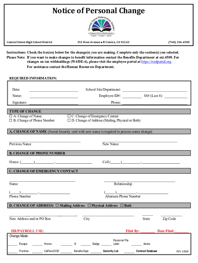 Get the free Notice of Personal Change 2-2020 - Central Union High ...