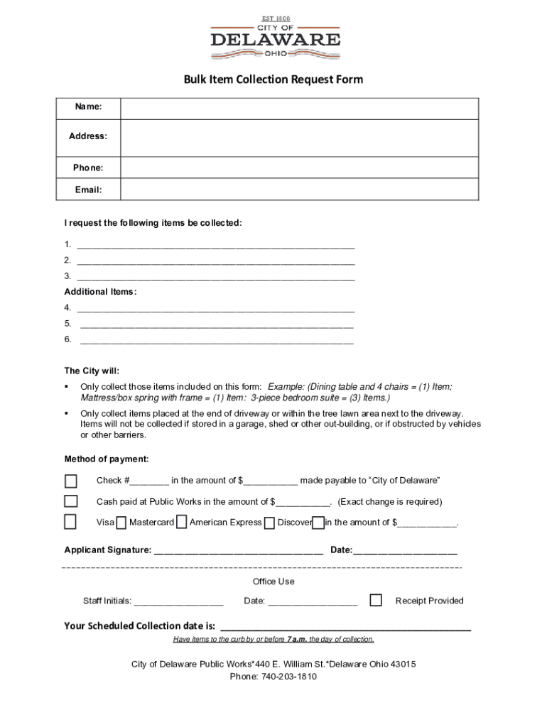 Get the free Bulk Item Collection Request Form - City of Delaware, Ohio