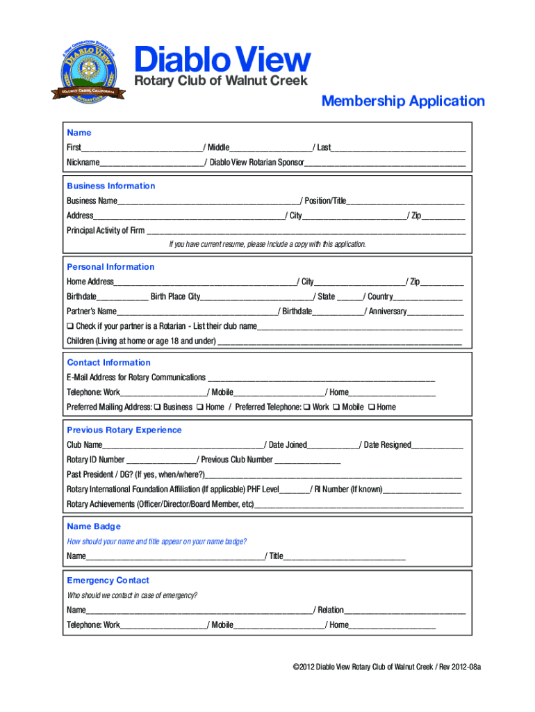 Diablo View Rotary Club of Walnut CreekMembership ApplicationName First / Middle / Last Nickname / Diablo View Rotarian Sponsor Business Information Business Name / Position/Title Address / City /