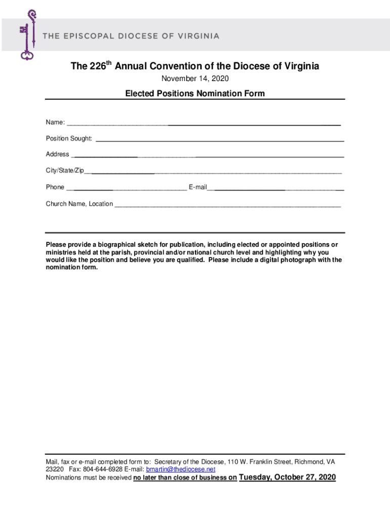 The 226th Annual Convention of the Diocese of Virginia November 14, 2020Elected Positions Nomination Forename: Position Sought: Address City/State/Zip Phone Email Church Name, Location Please provide