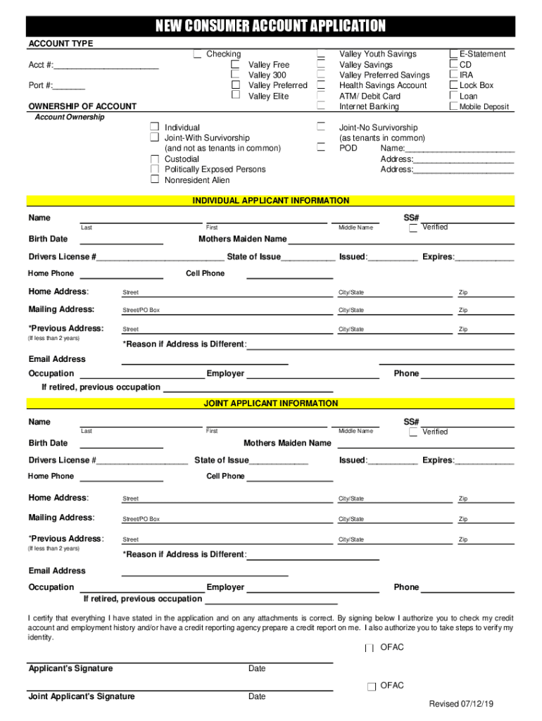 NEW CONSUMER ACCOUNT APPLICATION ACCOUNT TYPE Checking Acct #: Valley Free Valley 300 Valley Preferred Valley Elite Port #: OWNERSHIP OF Accountable Youth Savings Valley Preferred Savings Health Savings