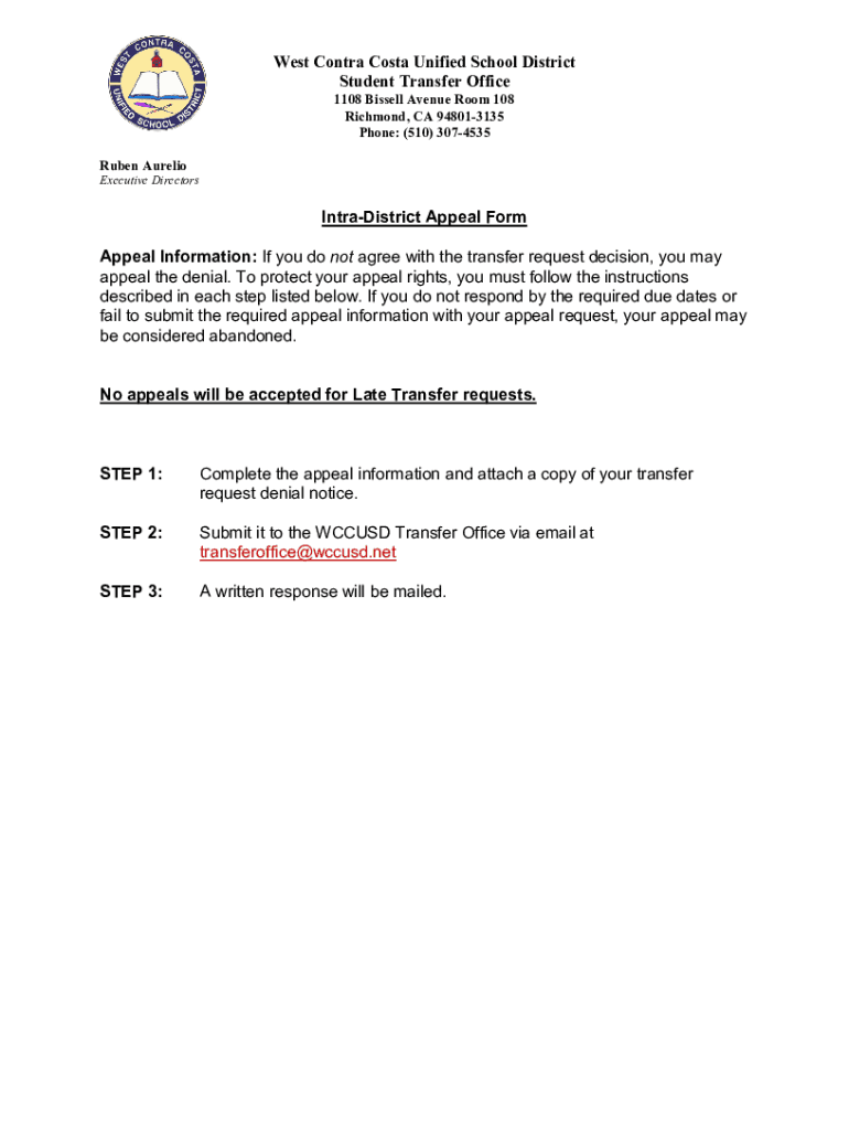 Phone: (510) 3074535Ruben AurelioExecutive DirectorsIntraDistrict Appeal Form