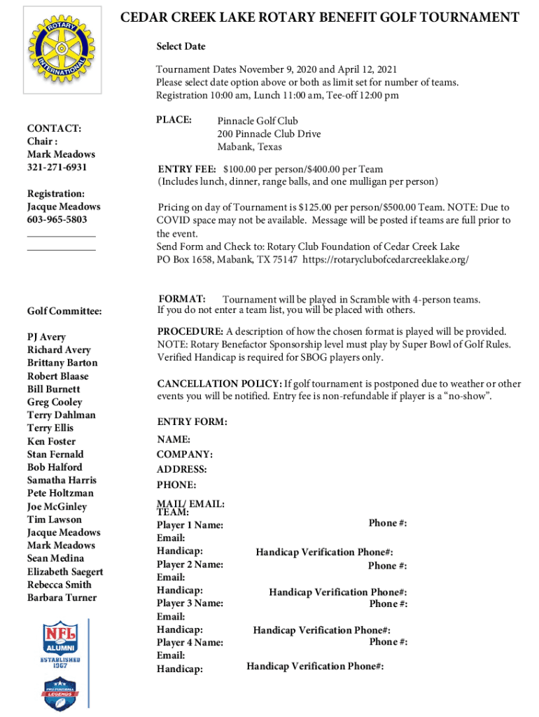 CEDAR CREEK LAKE ROTARY BENEFIT GOLF TOURNAMENT Select Date Tournament Dates November 9, 2020, and April 12, 2021, Please select date option above or both as limit set for number of teams. Registration