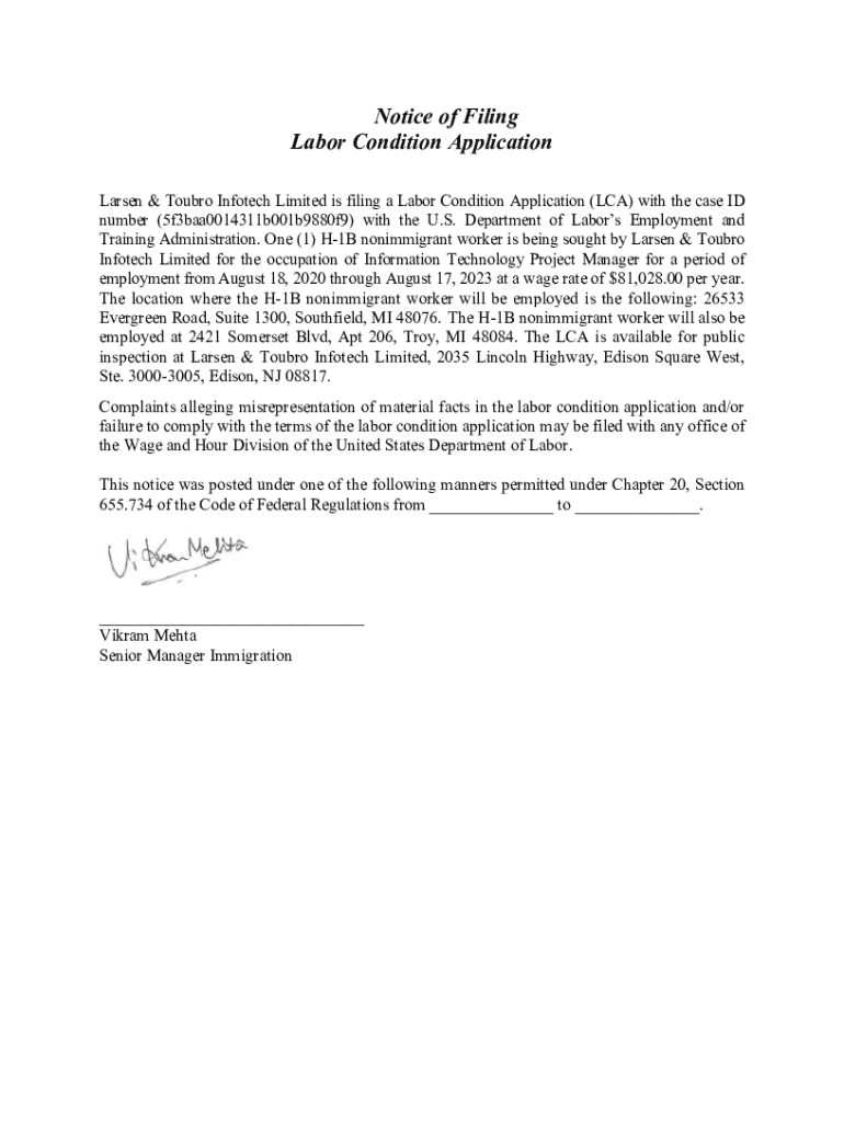 Notice of Filing Labor Condition Application Larsen & Tour Info tech Limited is filing a Labor Condition Application (LCA) with the case ID number (5f3baa0014311b001b9880f9) with the U.S. Department
