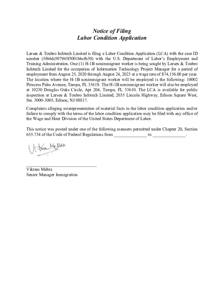 Notice of Filing Labor Condition Application Larsen & Tour Info tech Limited is filing a Labor Condition Application (LCA) with the case ID number (5f44dc507945f5001bbcfb30) with the U.S. Department