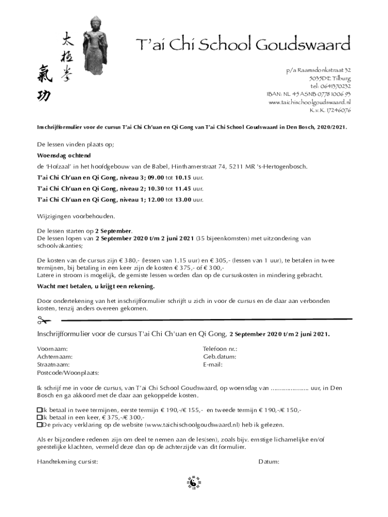 Tai Chi School Goudswaard p/a Raamsdonkstraat 32 5035DE Tilburg tel: 0641370232 IBAN: NL 45 ASB 0778 1006 93 www.taichischoolgoudswaard.nl K.v.K. 17246076 Inschrijfformulier poor DE cursus Tai Chi