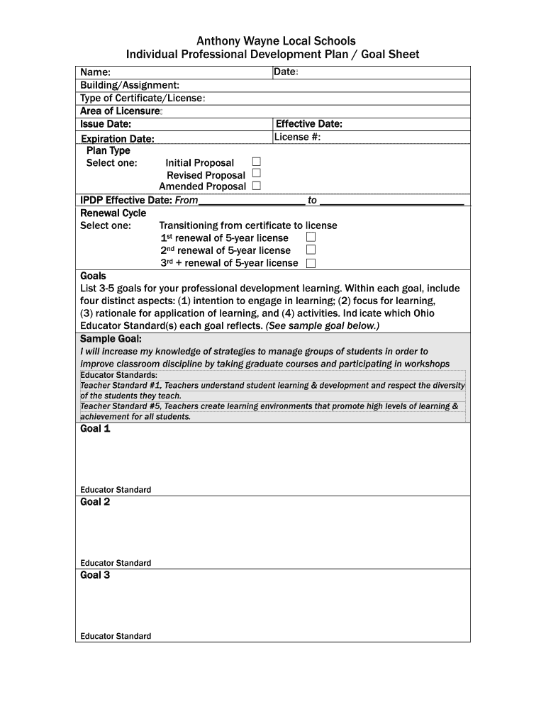 Anthony Wayne Local Schools Individual Professional Development Plan / Goal Sheet Date: Name: Building/Assignment: Type of Certificate/License: Area of Licensure: Effective Date: Issue Date: License
