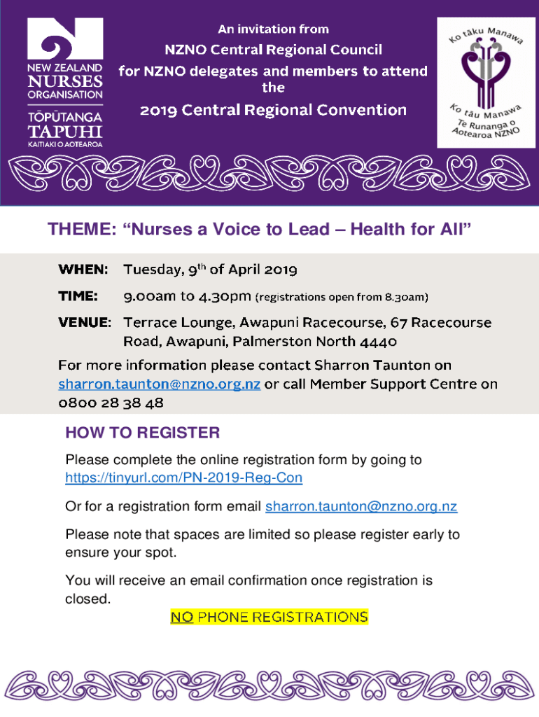 THEME: Nurses a Voice to Lead Health for Allow Registering Please complete the online registration form by going to https://tinyurl.com/PN2019RegCon Or for a registration form email Sharron. Taunton