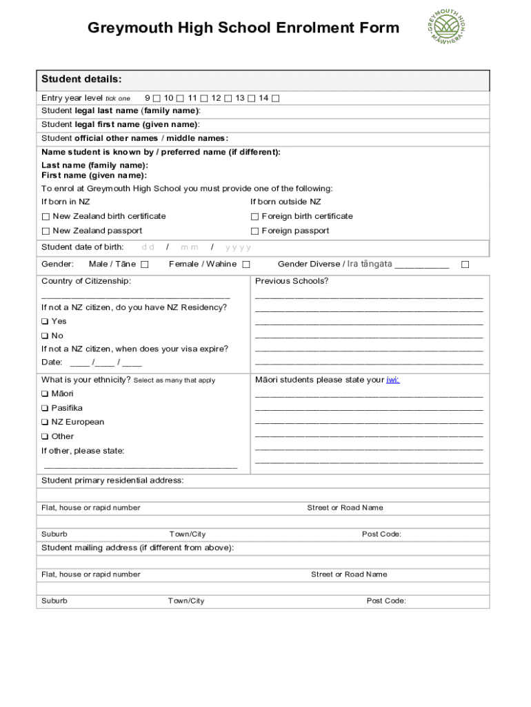 Get the free Greymouth High School Enrolment Form