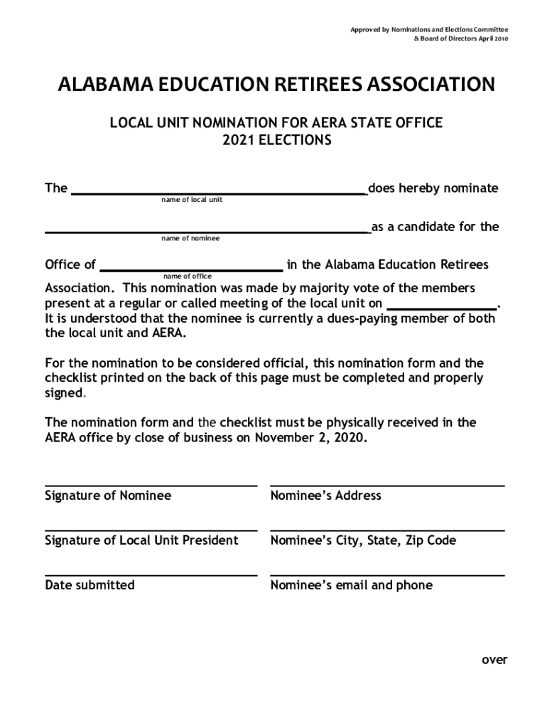 ApprovedbyNominationsandElectionsCommittee &BoardofDirectorsApril2010 ALABAMAEDUCATIONRETIREESASSOCIATION LOCAL UNIT NOMINATION FORA ERA STATE OFFICE 2021 ELECTIONS The does hereby nominate name of