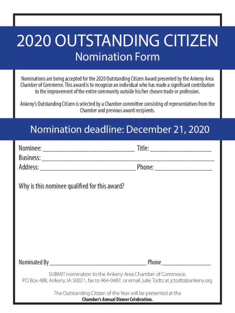 Nomination FormNominations are being accepted for the 2020 Outstanding Citizen Award presented by the Ankeny Area