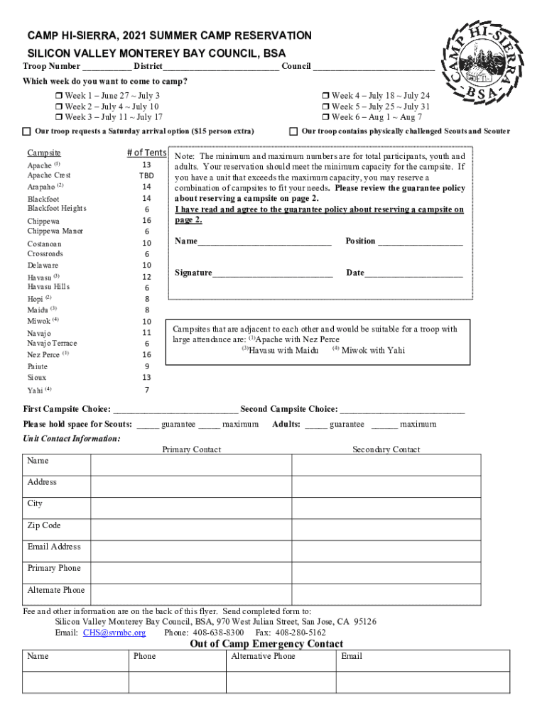 CAMP SIERRA, 2021 SUMMER CAMP RESERVATION SILICON VALLEY MONTEREY BAY COUNCIL, Troop Number District Council Which week do you want to come to camp? Week 1 June 27 July 3 Week 2 July 4 July 10 Week
