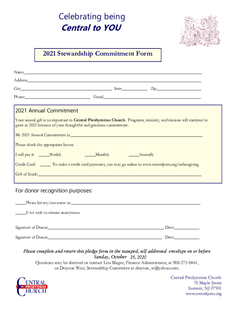 Celebrating being Central to YOU2021 Stewardship Commitment Form Name Address City State Zip Phone Email 2021 Annual Commitment Your annual gift is so important to Central Presbyterian Church. Programs,
