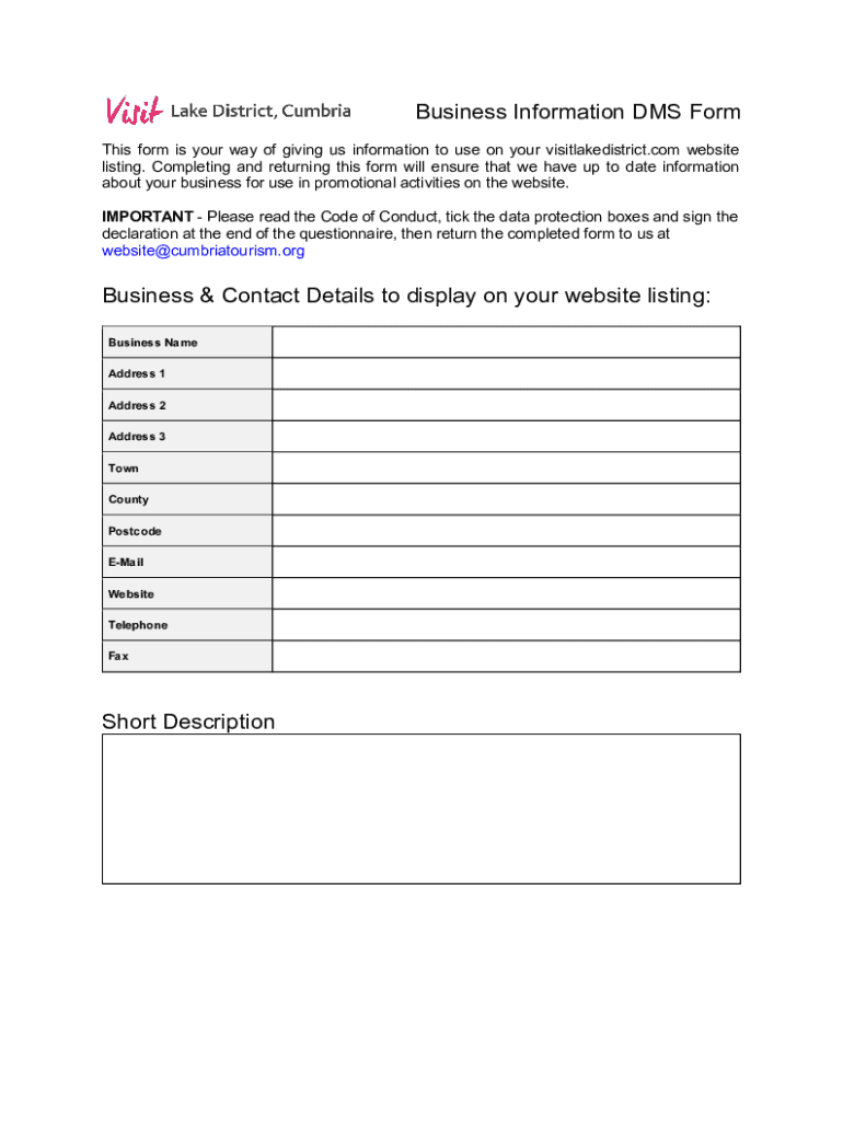 Business Information DMS Form This form is your way of giving us information to use on your visitlakedistrict.com website listing. Completing and returning this form will ensure that we have up to