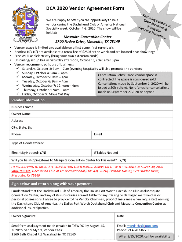 DCA 2020 Vendor Agreement Form We are happy to offer you the opportunity to be a vendor during the Dachshund Club of America National Specialty week, October 48, 2020. The show will be held at:Mesquite