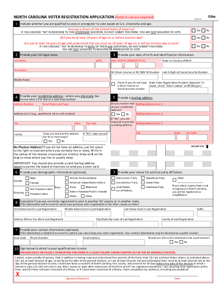 NORTHCAROLINAVOTERREGISTRATIONAPPLICATION(fieldsinredarerequired)2019.1006w1 IndicatewhetheryouarequalifiedtovoteorpreregistertovotebasedonU. S.citizenshipandage.