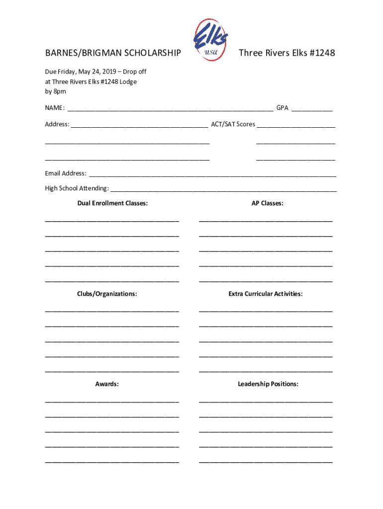 BARNES/BRIGMANSCHOLARSHIPThreeRiversElks#1248DueFriday,May24,2019Dropoff atThreeRiversElks#1248Lodge by8pm NAME: GPA Address: ACT/Outscores Misaddress: HighSchoolAttending: DualEnrollmentClasses:APC