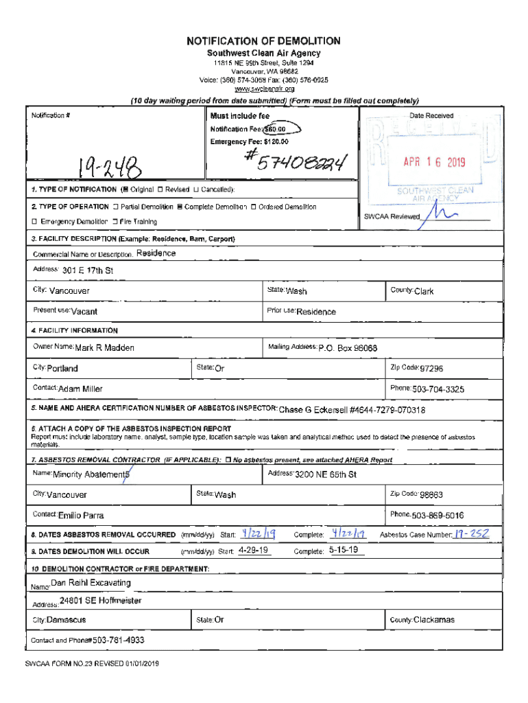 NOTIFICATION OF DEMOLITION Southwest Clean Air Agency 11815 NE 99th Street. Suite 1294 Vancouver, WA 98682 Voice: (360) 5743058 Fax: (360) 5760925 www.swcleanair.org(10 day waiting period from date