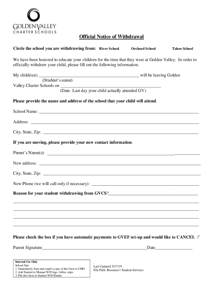 Get the free Official Notice of Withdrawal - Golden Valley Charter
