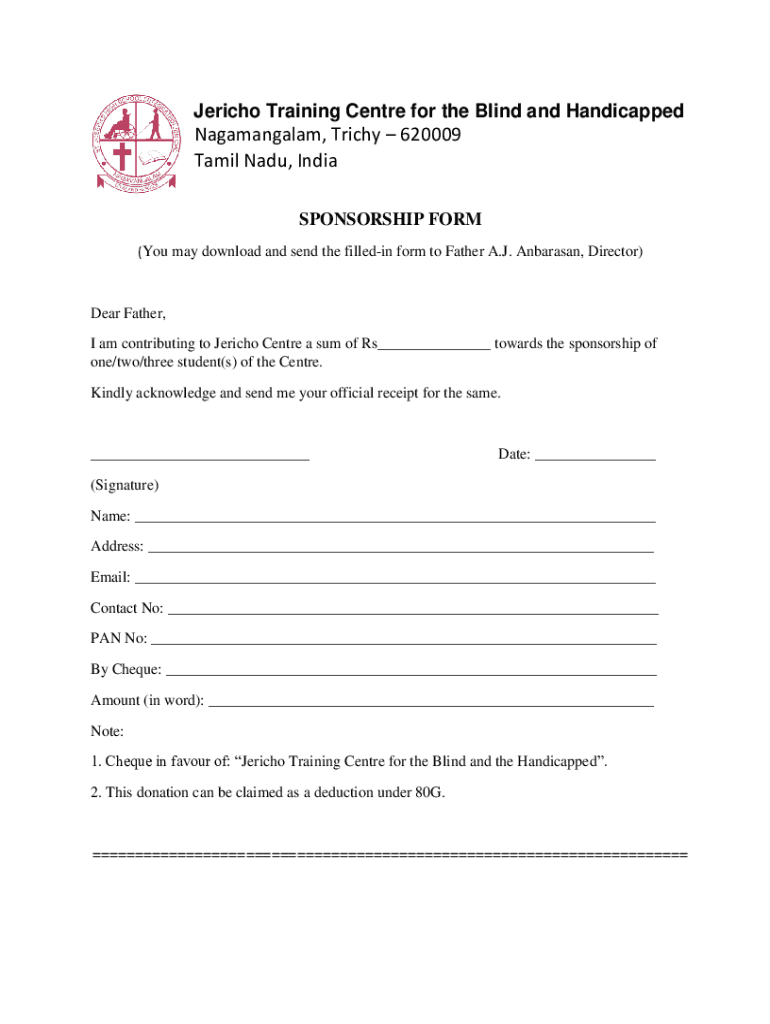 Jericho Training Center for the Blind and HandicappedNagamangalam, Tricky 620009 Tamil Nadu, India SPONSORSHIP FORM (You may download and send the filled in form to Father A.J. Anbarasan, Director)Dear