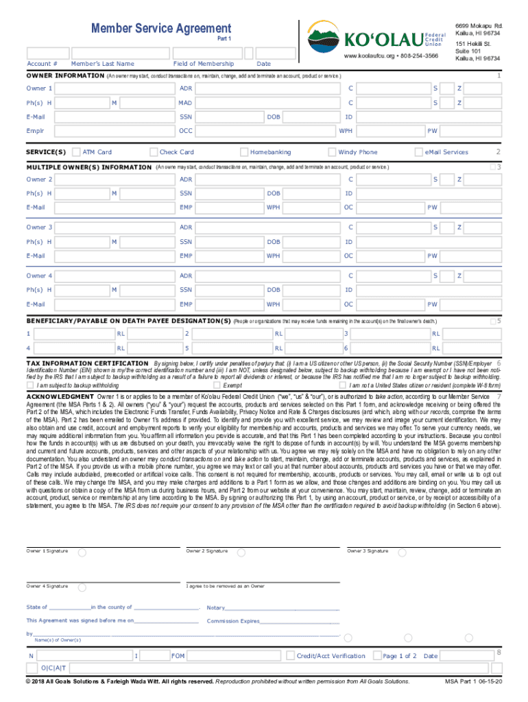 Member Service Agreement6699 Okapi Rd. Kailua, HI 96734Part 1Account #Members Last Masefield of Membership.koolaufcu.org 8082543566Date151 Heidi St. Suite 101 Kailua, HI 967341OWNER INFORMATION (An