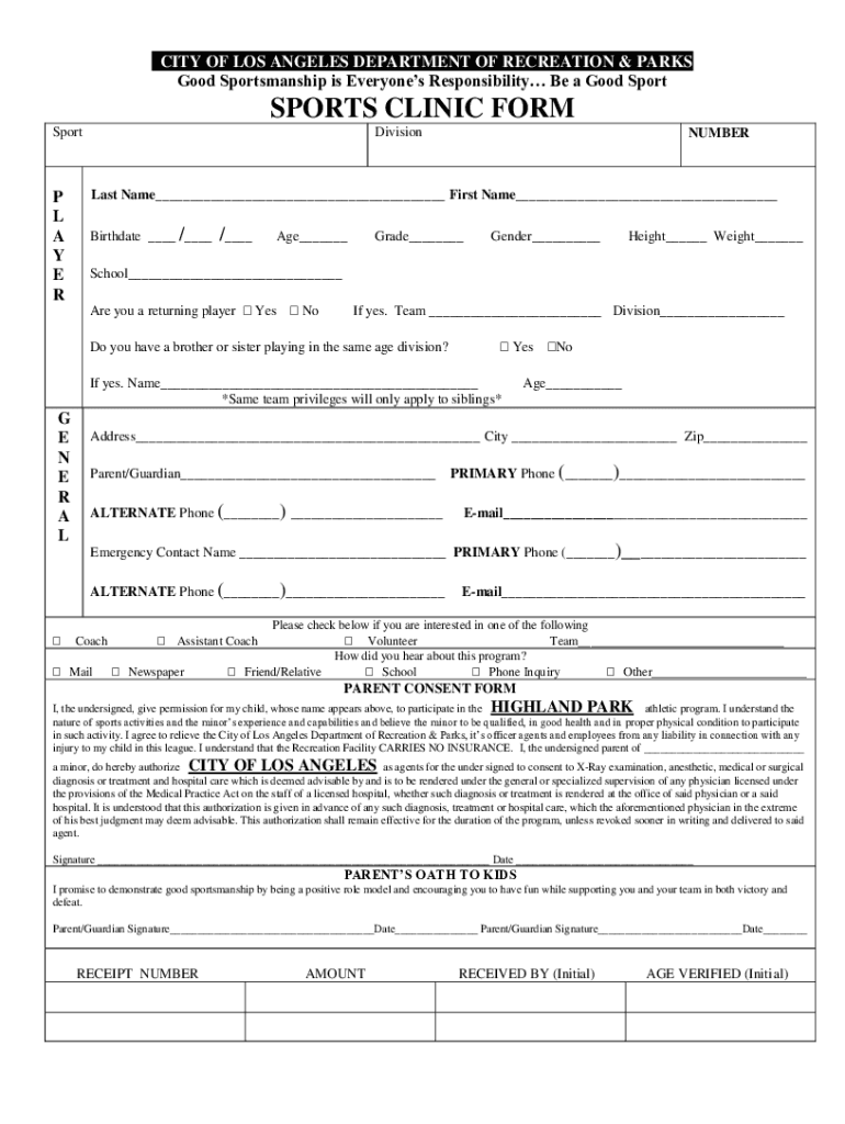 CITY OF LOS ANGELES DEPARTMENT OF RECREATION & PARKS Good Sportsmanship is Everyone's Responsibility Be a Good Spoilsports CLINIC FORM Sports L A Y E RDivisionNUMBERLast Name First Name Birthdate
