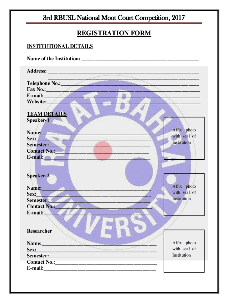 3rd BUS National Moot Court Competition, 2017 REGISTRATION FORM INSTITUTIONAL DETAILS Name of the Institution: Address: Telephone No.: Fax No.: Email: Website: TEAM DETAILS Speaker1 Name: Sex: Semester: