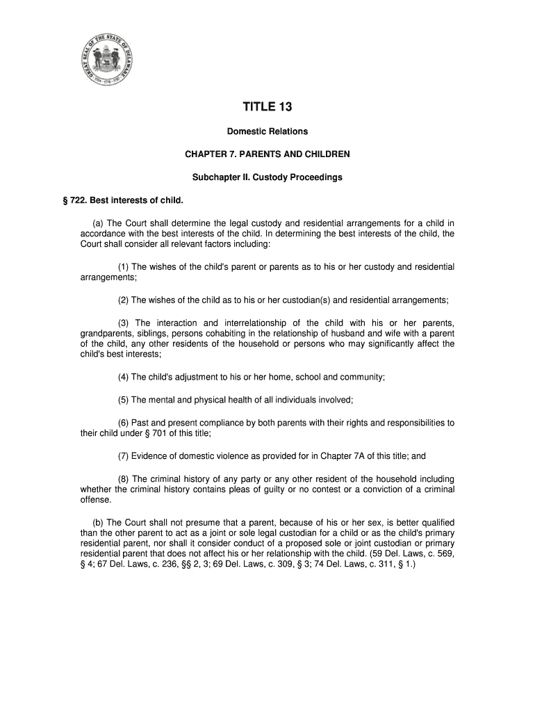 TITLE 13 Domestic Relations CHAPTER 7. PARENTS AND CHILDREN Subchapter II. Custody Proceedings 722. Best interests of child. (a) The Court shall determine the legal custody and residential arrangements