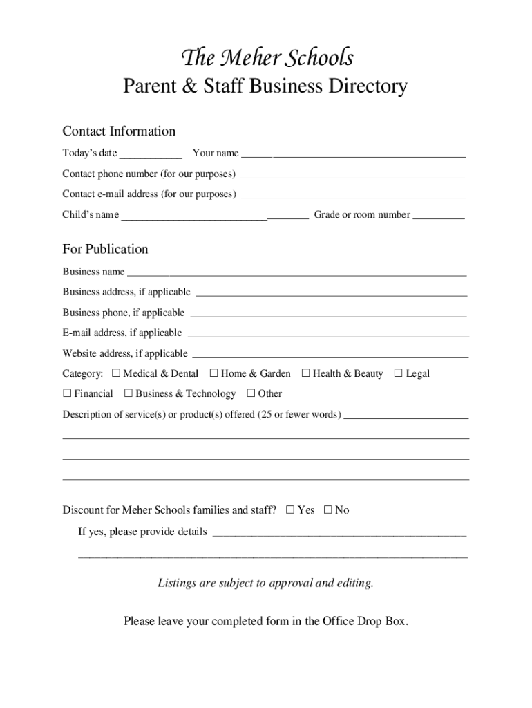 The Meter Schools Parent & Staff Business Directory Contact Information Today's date Your name Contact phone number (for our purposes) Contact email address (for our purposes) Child's name Grade or